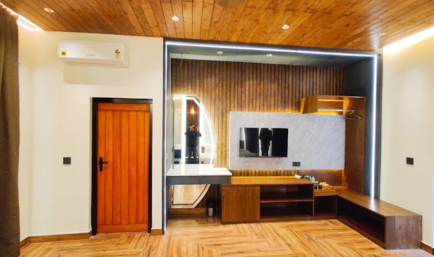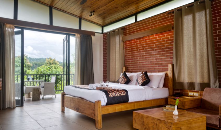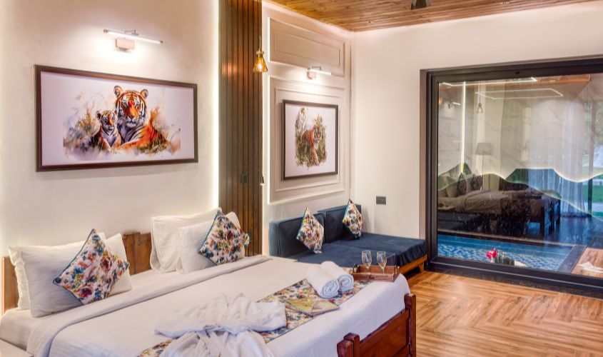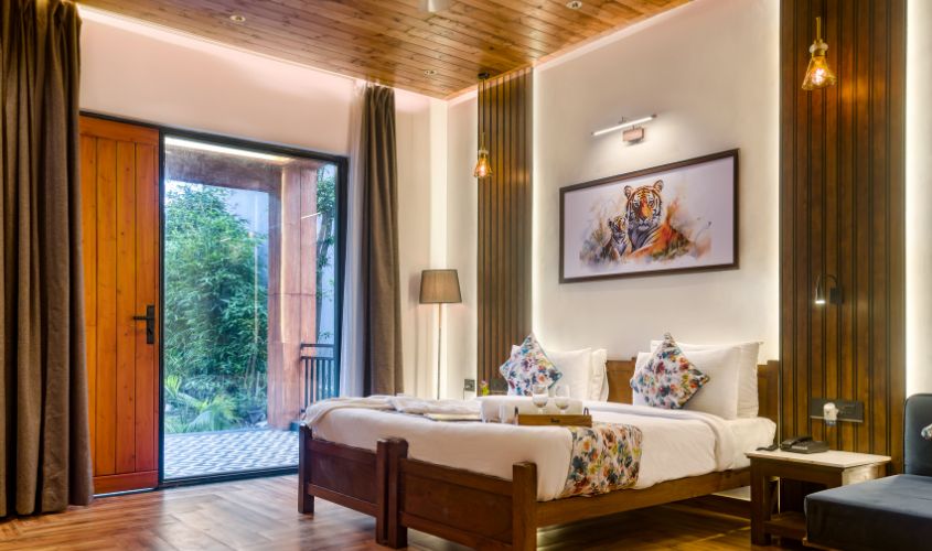 Nest Cottages is the highest category at Corbett Machaan Resort which comes with an area of 450 sq. ft offering a luxurious and serene retreat. There are 4 nest cottages available in the property. This contemporary cottage blends modern comforts with rustic charm, featuring spacious interiors, stylish furnishings and breathtaking views of the surrounding forest. These rooms comes with modern ameneties like air-conditioning, Private plunge pool and a private sit out area/ balcony. Ideal for nature lovers and adventure seekers, it offers a perfect escape to unwind and experience the tranquility of the wilderness in a cozy setting.